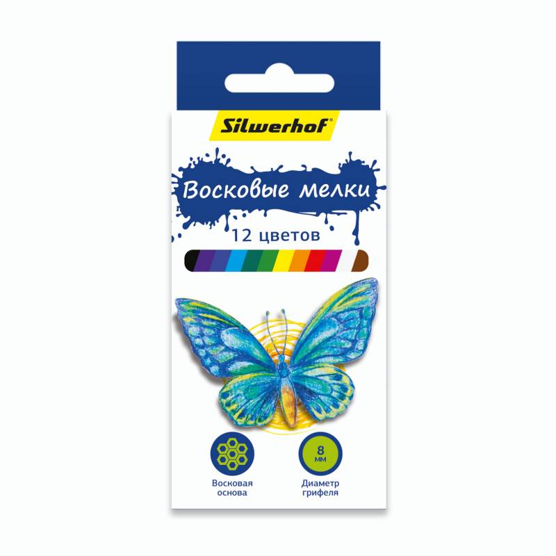 Восковые мелки Silwerhof 884169-12 Бабочки круглые 12цв. дл.89ммд.8мм картон.кор./европод.